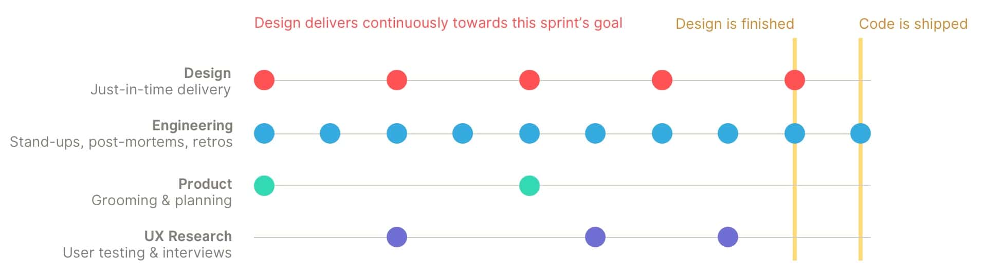 In response to this disconnect, designers are often working at least one sprint ahead of engineers. While one sprint might not seem like much of a lag, a typical product team learns a lot after the design hand-off.